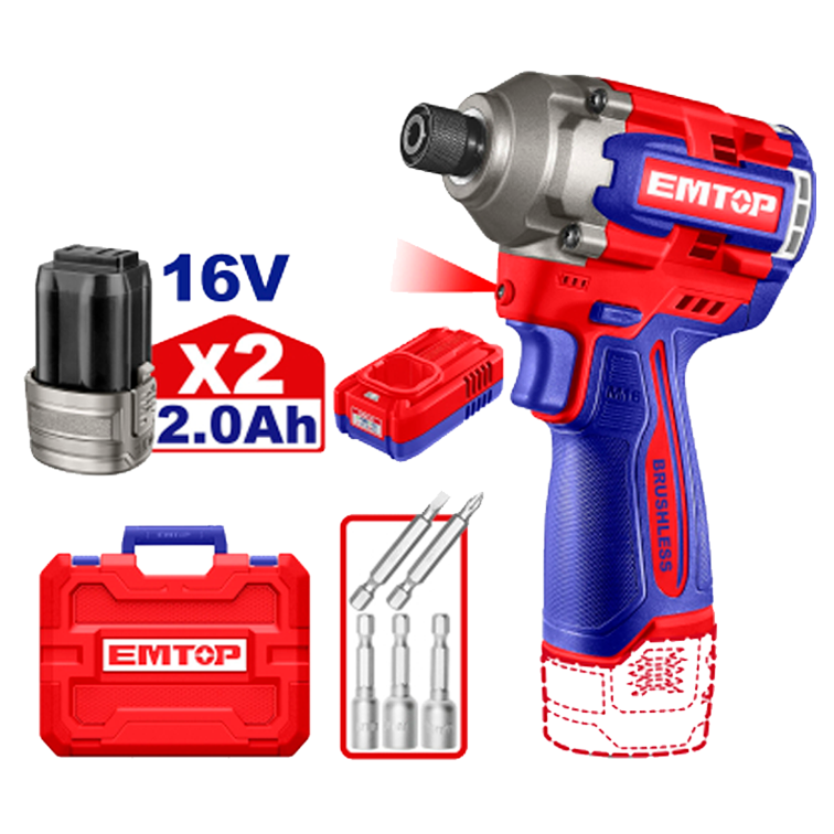 El Atornillador de Impacto Inalámbrico EMTOP de 16V, modelo ULCIRL16178, es una herramienta de alto rendimiento diseñada para tareas de fijación exigentes. Gracias a su motor sin escobillas (Brushless), ofrece una mayor eficiencia, una vida útil más larga y un diseño más compacto que los modelos con escobillas tradicionales.