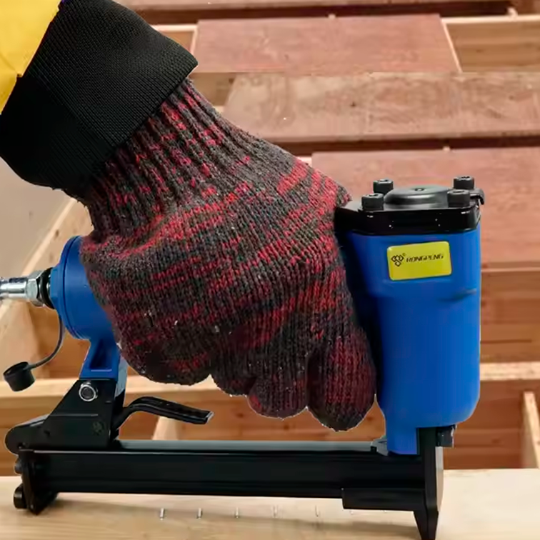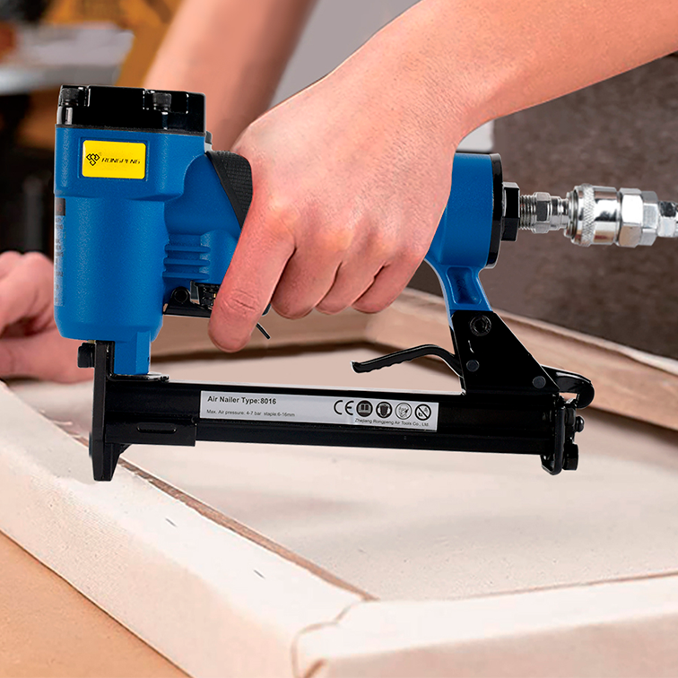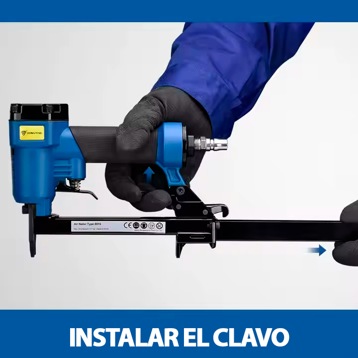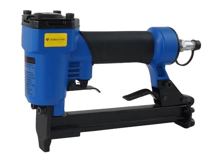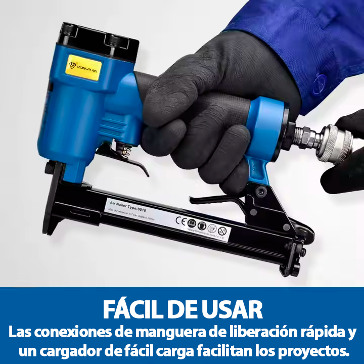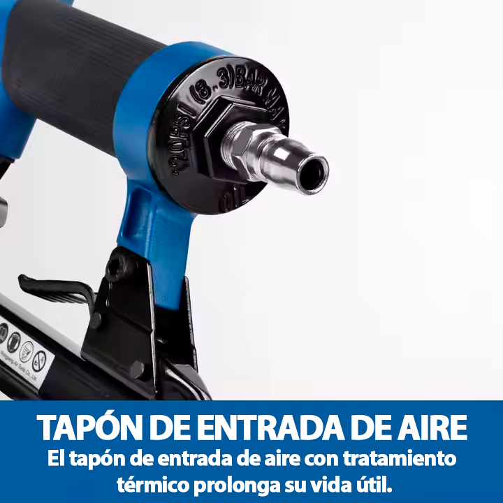Esta es una grapadora neumática profesional de diseño robusto y compacto, ideal para trabajos de tapicería, carpintería ligera, ensamblaje de marcos y otras aplicaciones que requieren fijación rápida y eficiente con grapas finas.