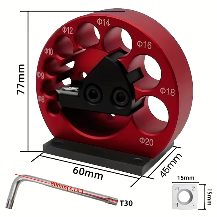 Esta plantilla robusta y de alta precisión está fabricada con un cuerpo de aleación de aluminio de alta resistencia que garantiza durabilidad y estabilidad. Su diseño compacto y base plana permite un montaje seguro en una mesa de trabajo o banco. La característica principal es la rueda de diámetros múltiples que contiene una variedad de orificios de precisión para crear tarugos de diversos tamaños.