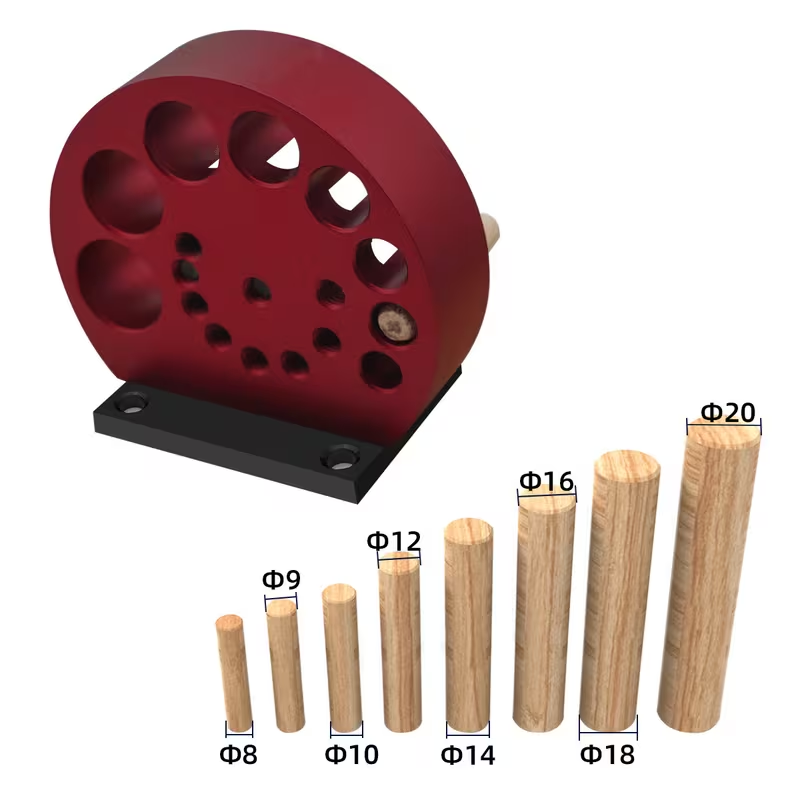 • Fácil Operación: Se utiliza introduciendo la pieza de madera pre-cortada a través del orificio del diámetro deseado mientras se utiliza un taladro o un destornillador de alto torque para girar la madera.