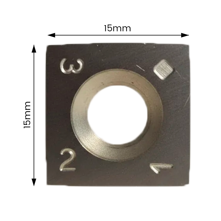 Este repuesto de Carburo Cuadrado de 15mm, diseñado específicamente como elemento de corte reemplazable para herramientas de carpintería. Su aplicación principal es en las Guías para Elaborar Tarugos de madera.